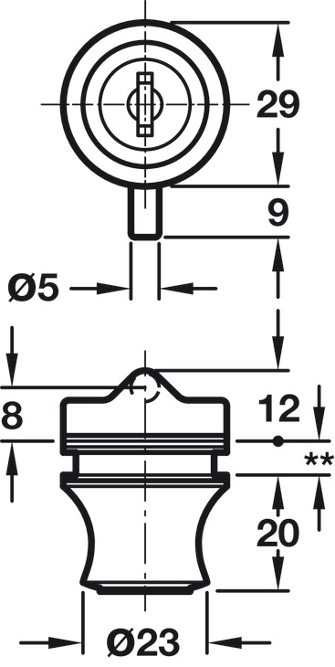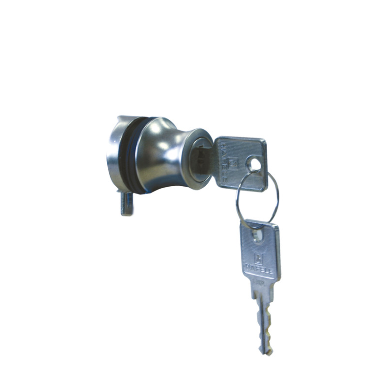 Cerradura puerta giratoria cristal niquelado mate grosor 4-6mm. Fundición zinc, bombillo chapitas fijo, 6 pernos seguridad. Cierres iguales N 7921 PL. Atornillado pared trasera. Ideal vitrinas y muebles cristal.