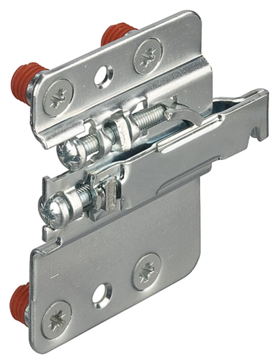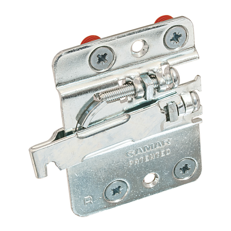 Colgador armario inferior acero galvanizado derecho 55kg/pieza (120kg/par). Regulación altura 22mm, profundidad 19mm. Montaje embutido a presión. Certificado según DIN EN 15939. Requiere placa soporte y tapas. Ideal muebles bajos cocina.