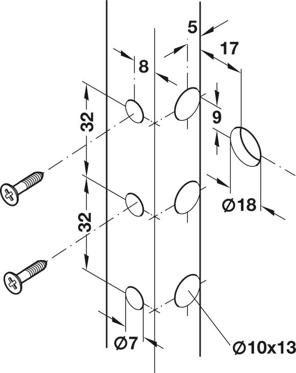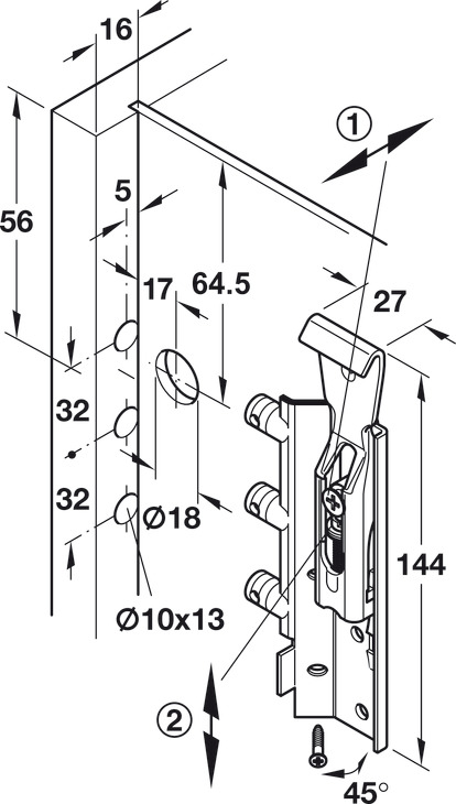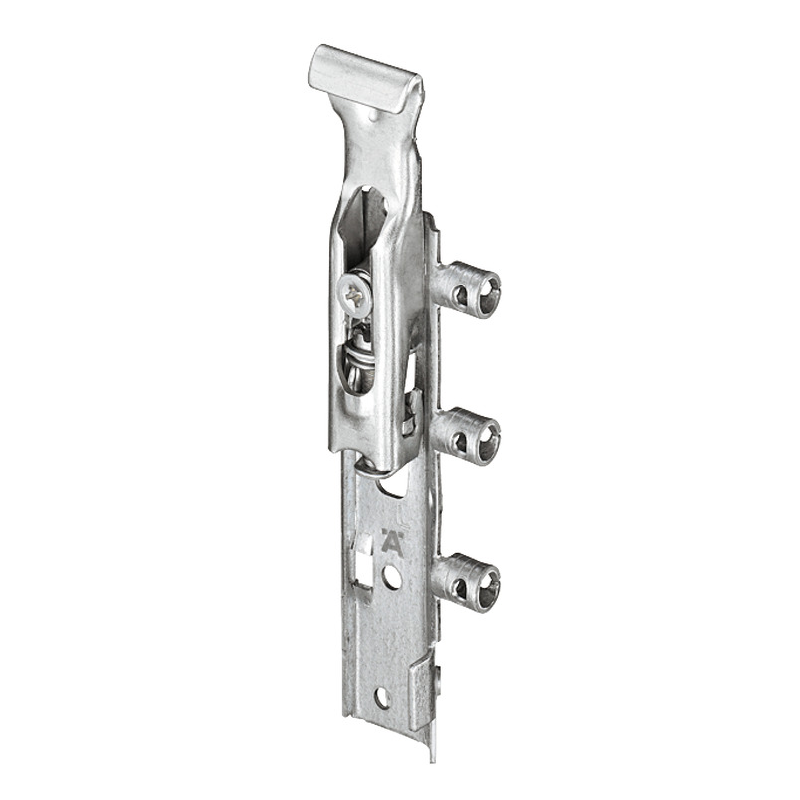 Colgador oculto armario izquierdo acero galvanizado 65kg/pieza (130kg/par). Montaje rápido con palanca integrada. Regulación altura 17mm, profundidad 16mm desde parte delantera. Certificado DIN EN 68840. Invisible tras montaje.