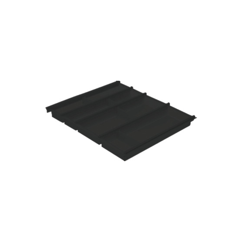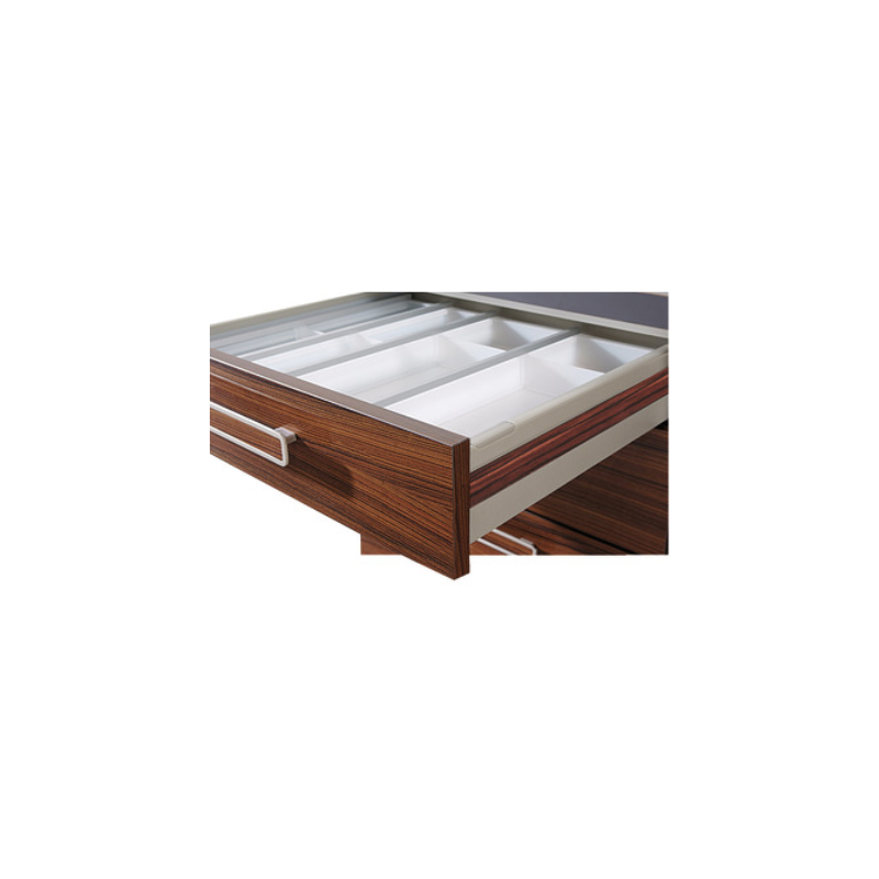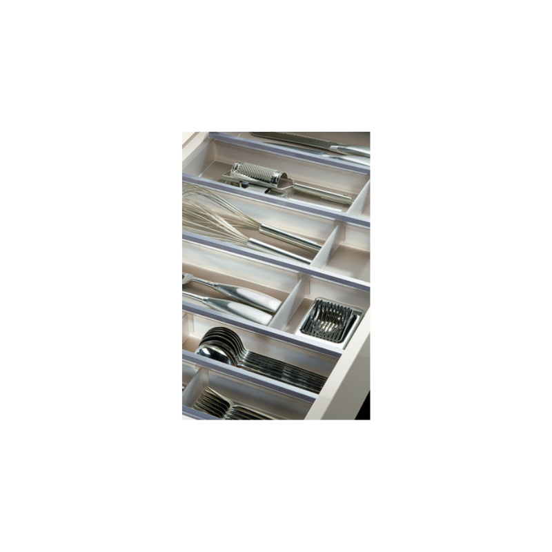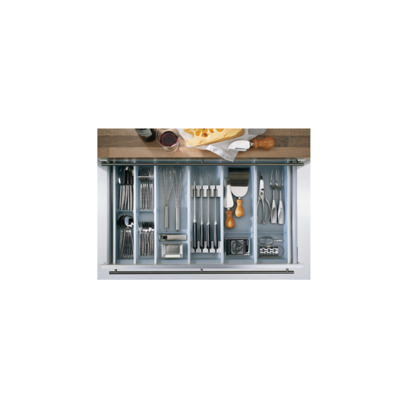 Fabricado en plástico de alta calidad con detalles en aluminio, garantiza resistencia, durabilidad y una excelente organización de cubiertos y utensilios. Diseñado específicamente para cajones con ancho de cuerpo de 900 mm, se adapta perfectamente al sistema Legrabox, optimizando cada espacio interior.