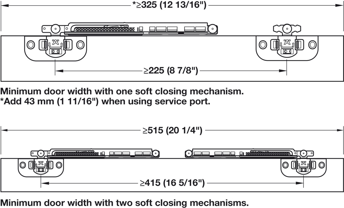 Distancia entre ejes: Respetar la distancia mínima de 415 mm entre ejes de los mecanismos para garantizar el correcto funcionamiento del autocierre bidireccional (225 mm para funcionamiento sin amortiguación bilateral).