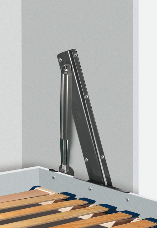 Kit herrajes Bettlift para camas abatibles longitudinales construcción propia. Acero negro grafito RAL 9011, capacidad 100kg. Incluye par herrajes cojinete giratorio, pernos muelles gas, 2 seguros antivuelco. Ideal fabricantes y carpinteros.