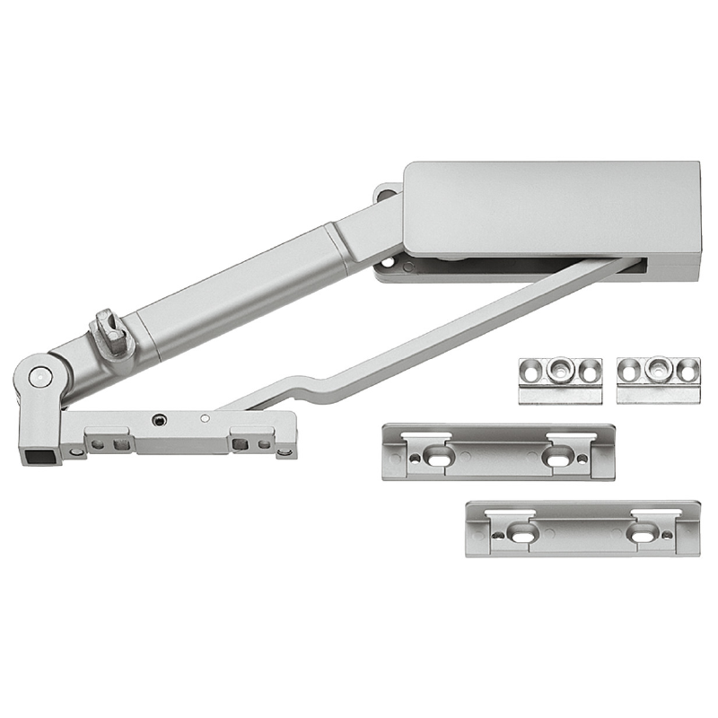 Herraje para Puerta Giratoria Swingfront 20 FB – Plata Lacado. Sistema de apertura basculante para acceso total. Capacidad hasta 20 kg. Entrada cero para elementos extraíbles. Amortiguación integrada. Para puertas de madera o marco aluminio estrecho. Válido para puertas individuales, dobles y esquinas. Perfil y bisagra intermedia se venden por separado.