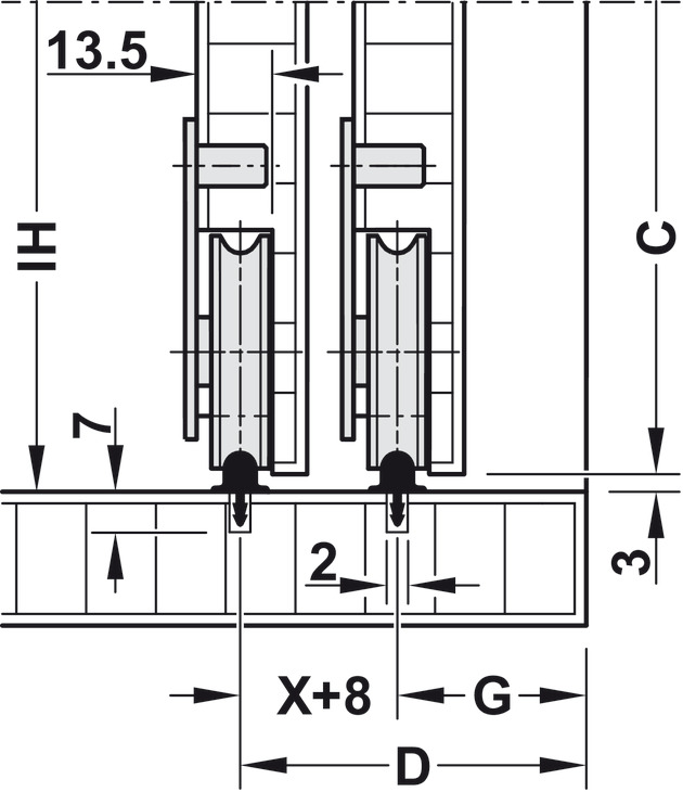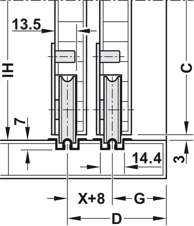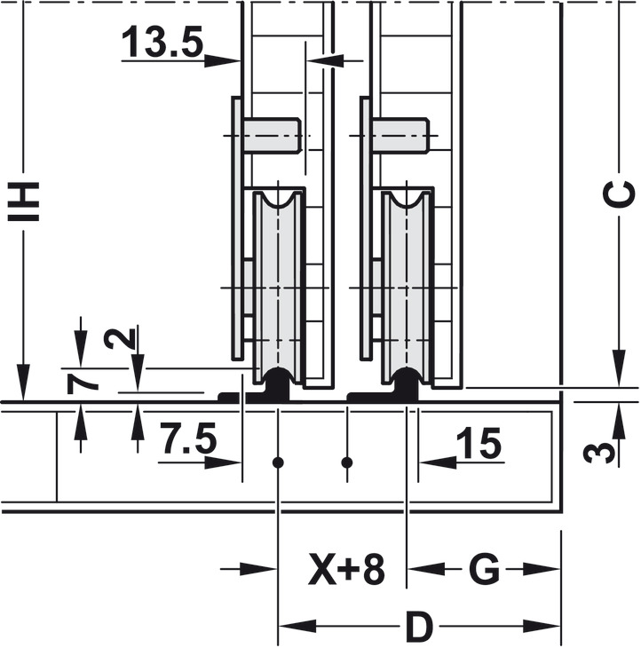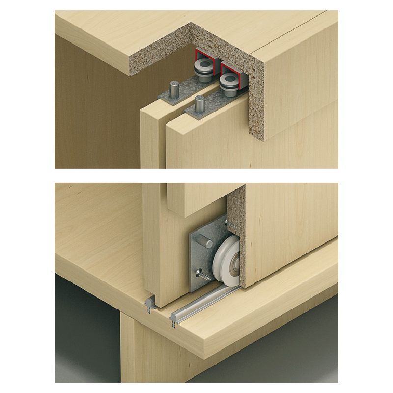 Juego de Herraje Slido Classic 55 IF – Infront – 2 Puertas de Cristal. Para puertas correderas de cristal con deslizamiento inferior hasta 55 kg. Grandes rodillos con rodamientos de bolas para excelente rodadura. Incluye amortiguadores, ajuste de altura ±2 mm y seguros contra desenganche. Carriles no incluidos (pedir por separado). Ideal para vitrinas, expositores y proyectos de diseño con puertas de cristal.