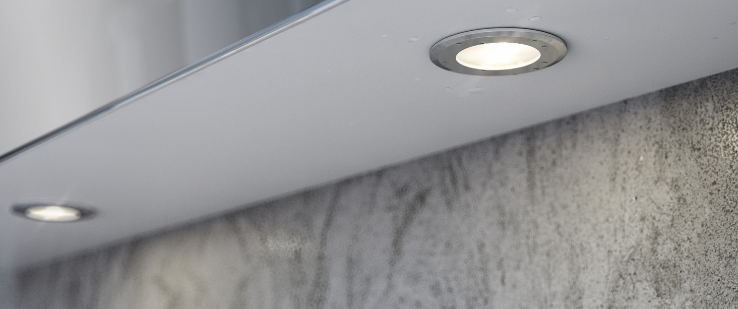 Iluminación empotrada en suelos o techos con riesgo ocasional de agua.