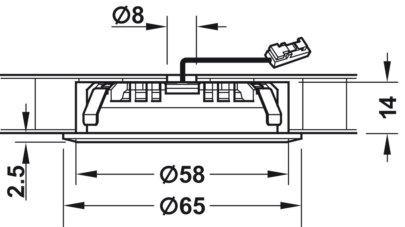 | Instalación empotrada | Perforación de 58 mm + sistema de clip | IP65 desde abajo (resistente a chorro) |