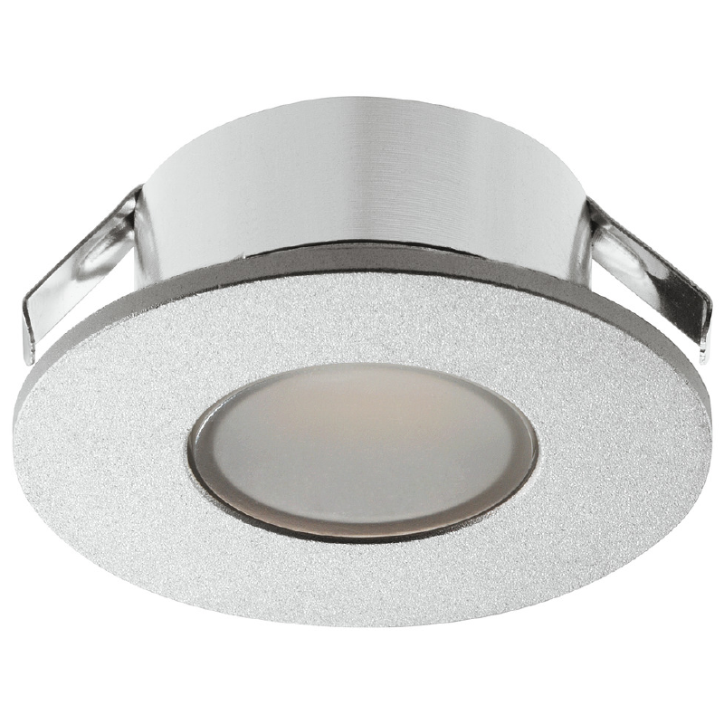 Lámpara LED Compacta Häfele Loox 2022 – Redonda 26 mm – 1,5W 4000K Blanco Frío. Aprovecha perforaciones de minibisagras. Cuerpo de aluminio anodizado plata. IP44 empotrable / IP20 superficie. Regulable. Ideal para renovaciones sin obras. Cable 2 m.