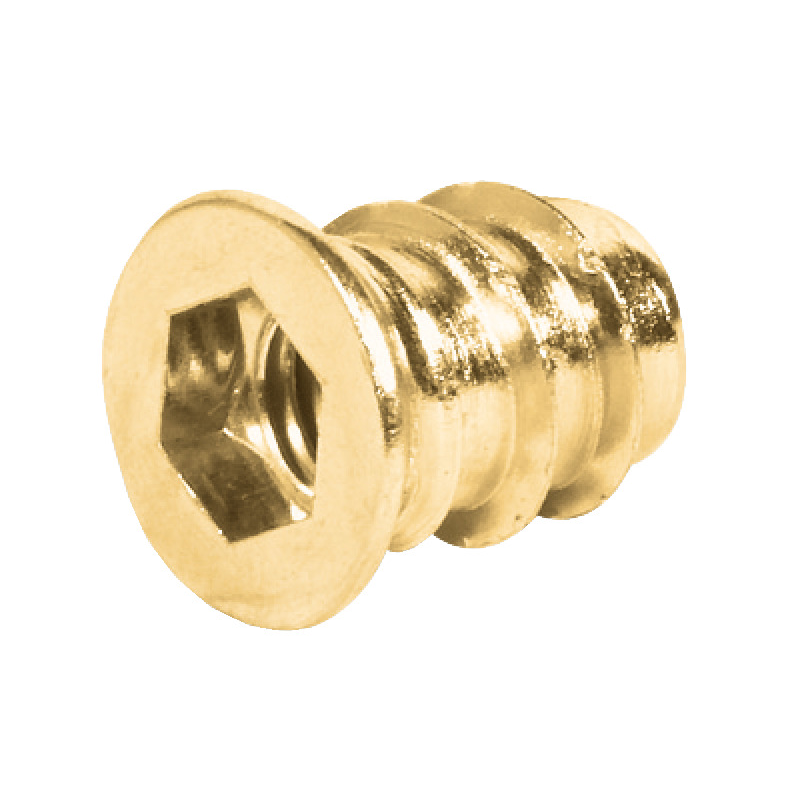 Manguitos M8 con reborde cromado amarillo en medidas 15mm y 12.5x17mm. Acero cromado amarillo, rosca interior M8, para taladros 10mm. Instalación con llave SW8. Alta capacidad estructural + estética decorativa visible.