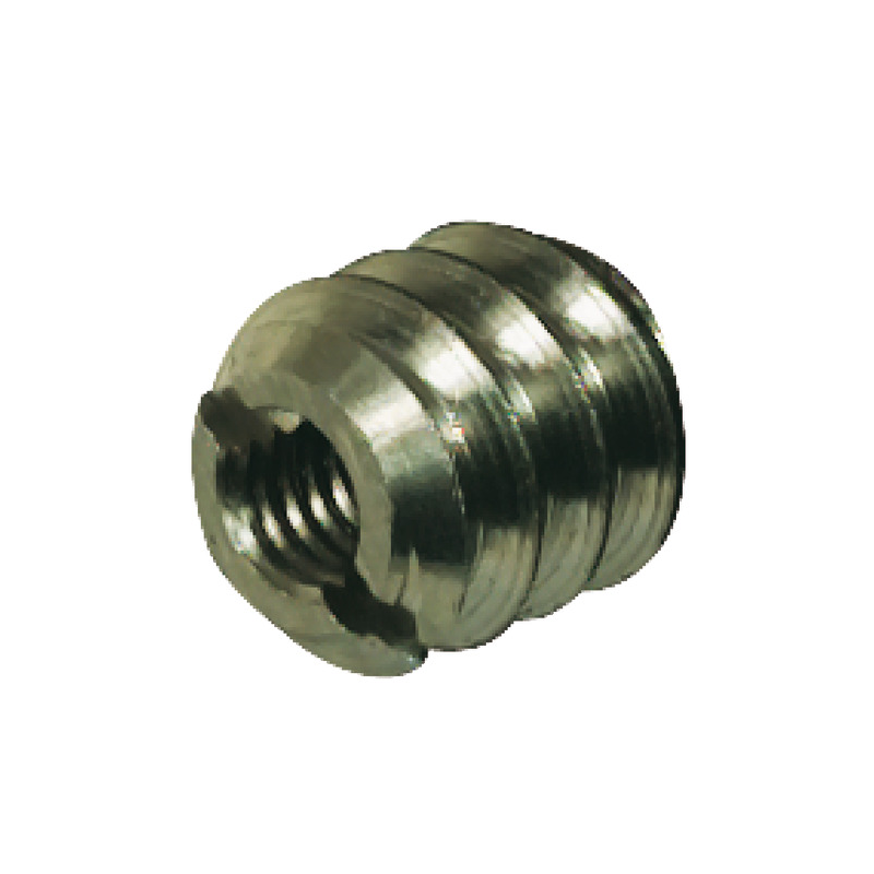 Manguito roscado galvanizado M8/16x18mm. Acero galvanizado, rosca exterior 16mm, interior M8. 18mm longitud para materiales gruesos. Para crear puntos roscados estructurales en madera/aglomerado. Ideal uniones alta carga.