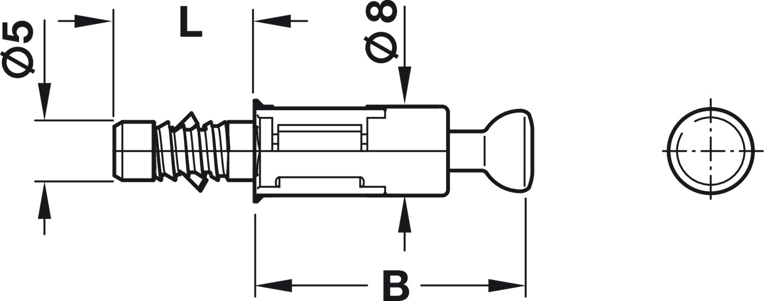Perno expansible Minifix® C100 para taladro 5mm. Longitud rosca 11,8mm, medida B 34mm. Montaje unilateral sin herramientas, no daña superficies. Plástico+zinc acabado natural. Ideal paneles delgados, espacios reducidos.