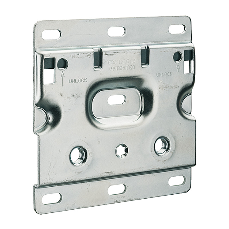 Placa soporte galvanizada 120x120mm con seguro antidesenganche para colgadores grandes cargas. Distancia taladros 48mm. Evita separación accidental del armario. Libera espacio para cajones. Seguridad crítica profesional.