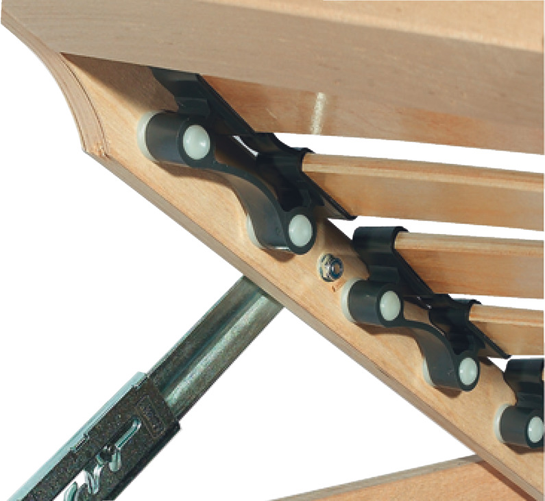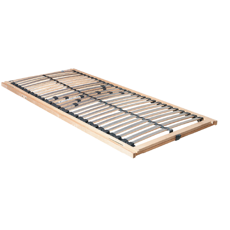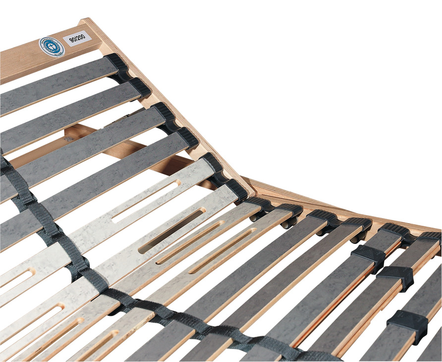 Somier Sanobasic KF 100x200cm con ajuste cervical y podal. 28 lamas madera abedul, refuerzo lumbar quíntuple, distribución presión. Capacidad 130kg. Compatible colchones látex/espuma/muelles. Altura total 50mm.