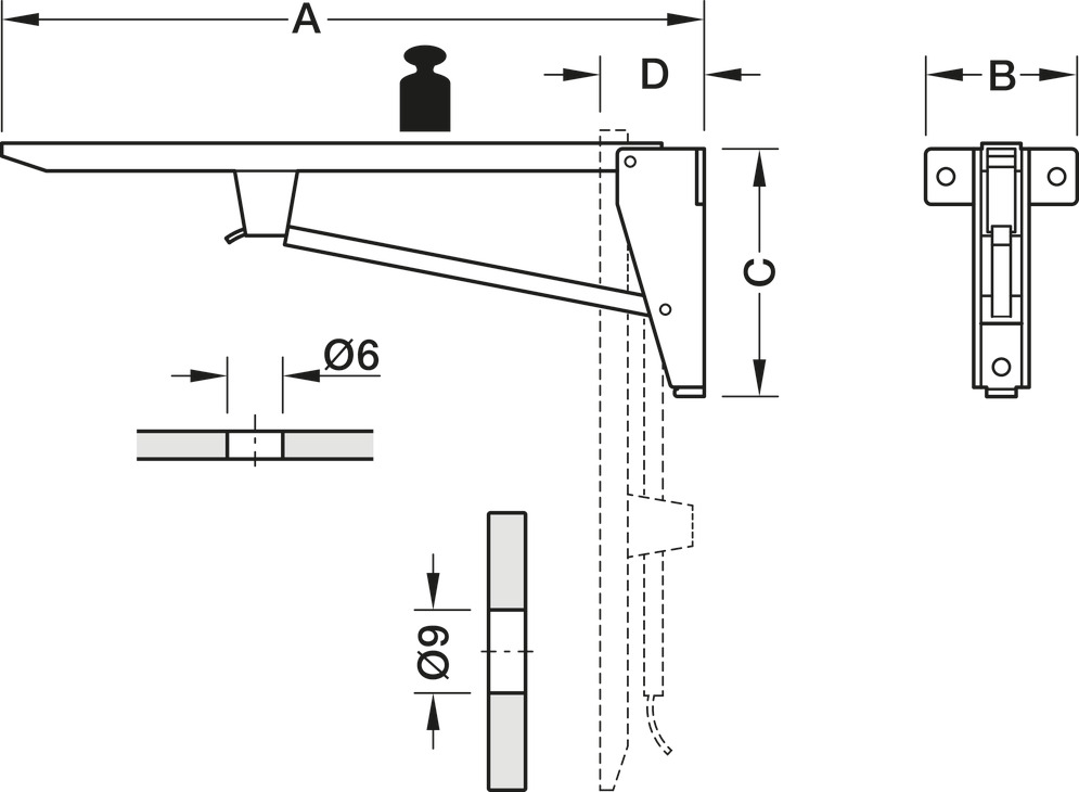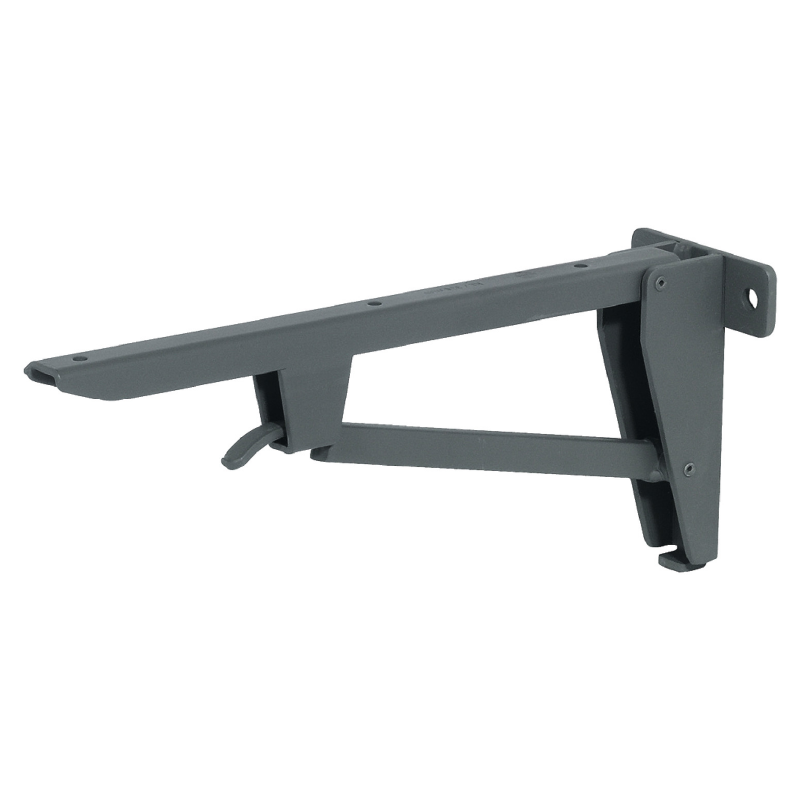 Consola abatible Hebgo acero imprimado alta capacidad 150kg por par. Medidas 380x82x134mm, medida D 50mm. Certificado DIN EN 16337. Bloqueo integrado. Ideal aplicaciones industriales, talleres, cargas pesadas. Montaje por pares distancia 700-750mm.