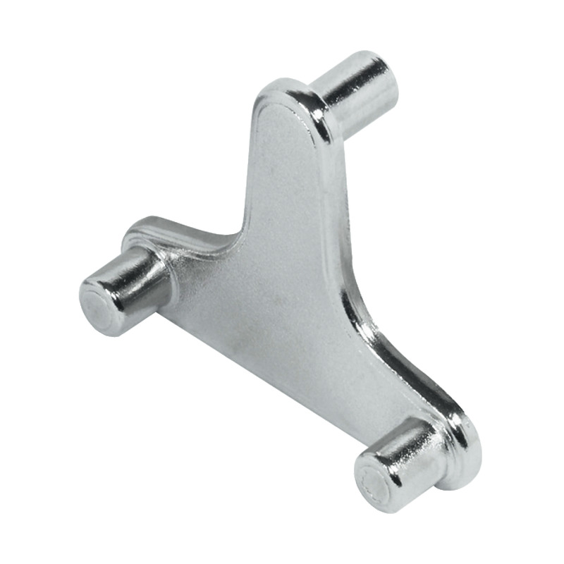 Soporte entrepaño madera Ixconnect SH-W-5045 niquelado. Fundición zinc, taladro 5mm, seguro antilevantamiento por enganche. Capacidad 9,4kg/pieza (37,6kg 4 soportes). Certificado DIN EN 16337. Ideal estanterías madera profesional.