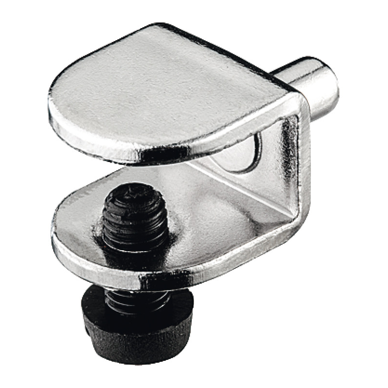 Soporte cristal niquelado embutido para grosor 8-9mm. Acero niquelado con tornillo retención negro. Taladro 5mm, montaje embutido. Ideal vitrinas, expositores, mobiliario diseño. Fijación segura y discreta.