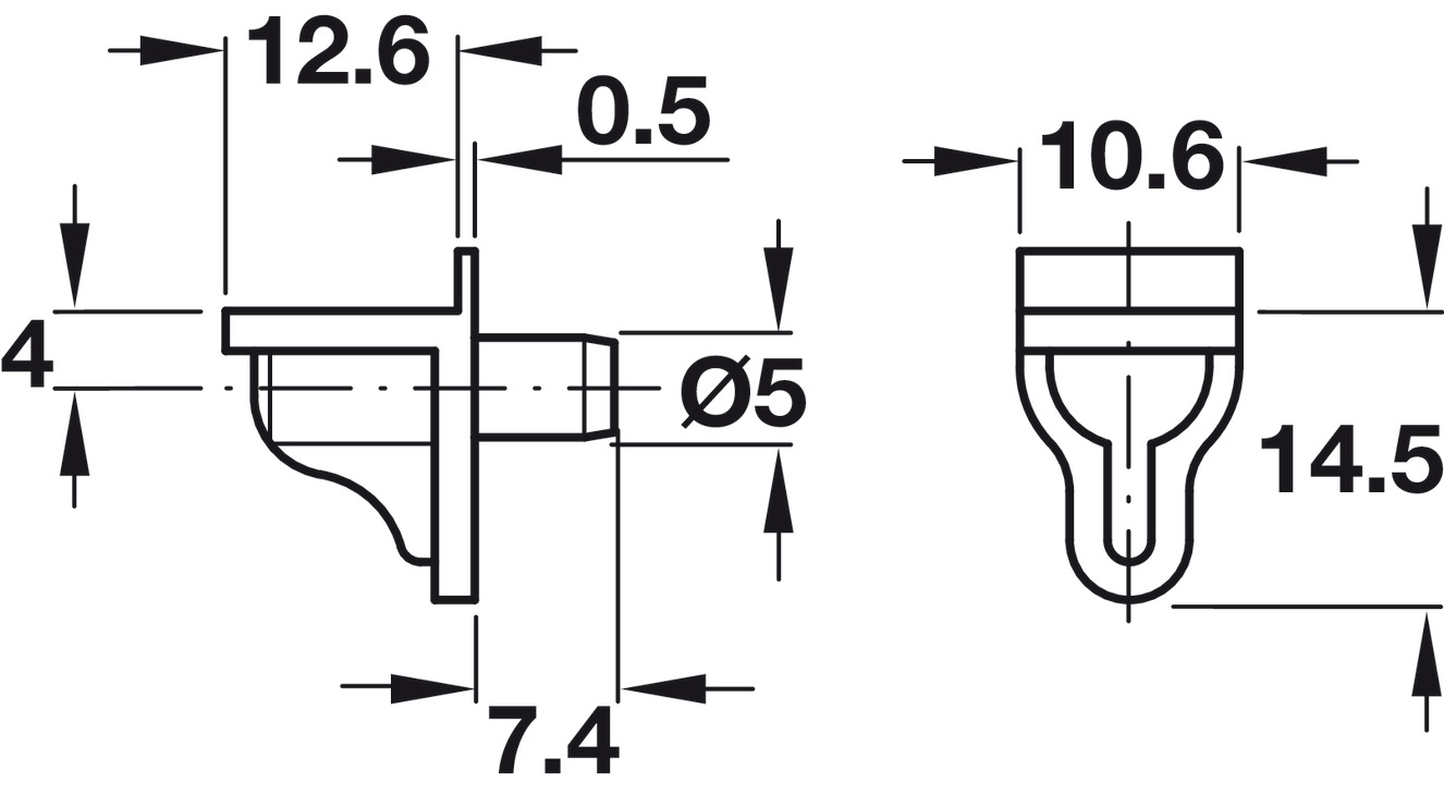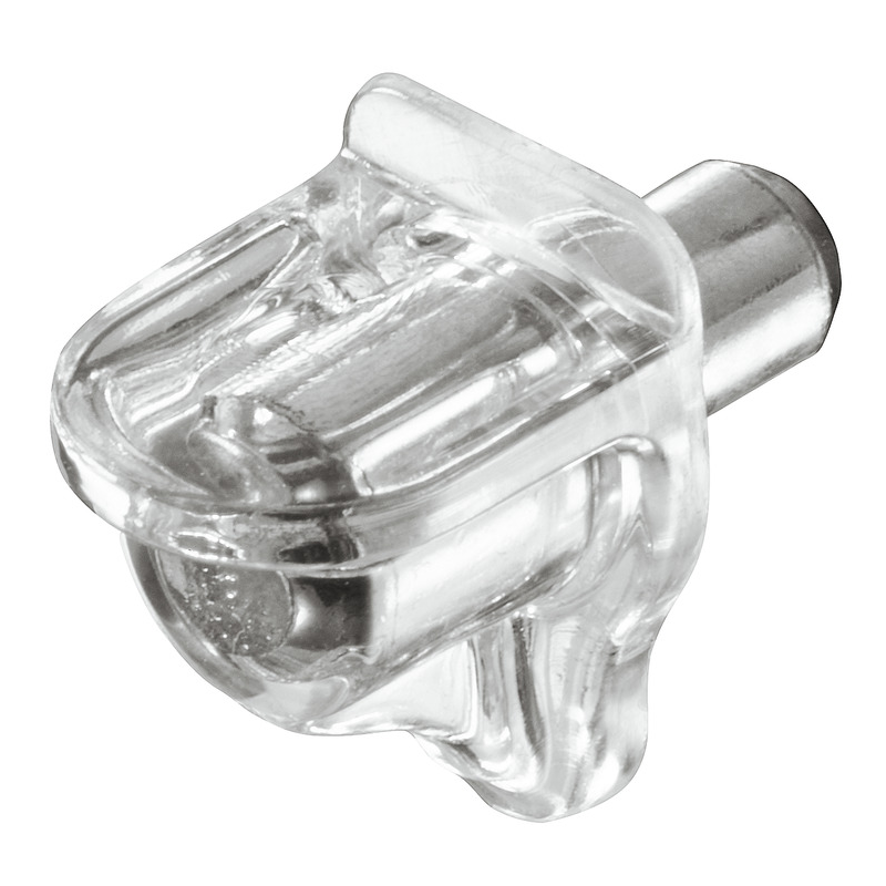 Soporte para estantes Häfele Ixconnect SH-M-5515 fabricado en plástico transparente con espiga de acero, diseñado para embutir en taladros de 5 mm. Aplicable para estantes de madera y cristal, con capacidad de carga de 3,1 kg por pieza (12,4 kg con 4 soportes). Comprobado según norma DIN EN 16337:2013-08 con placa de impacto de 1,7 kg.