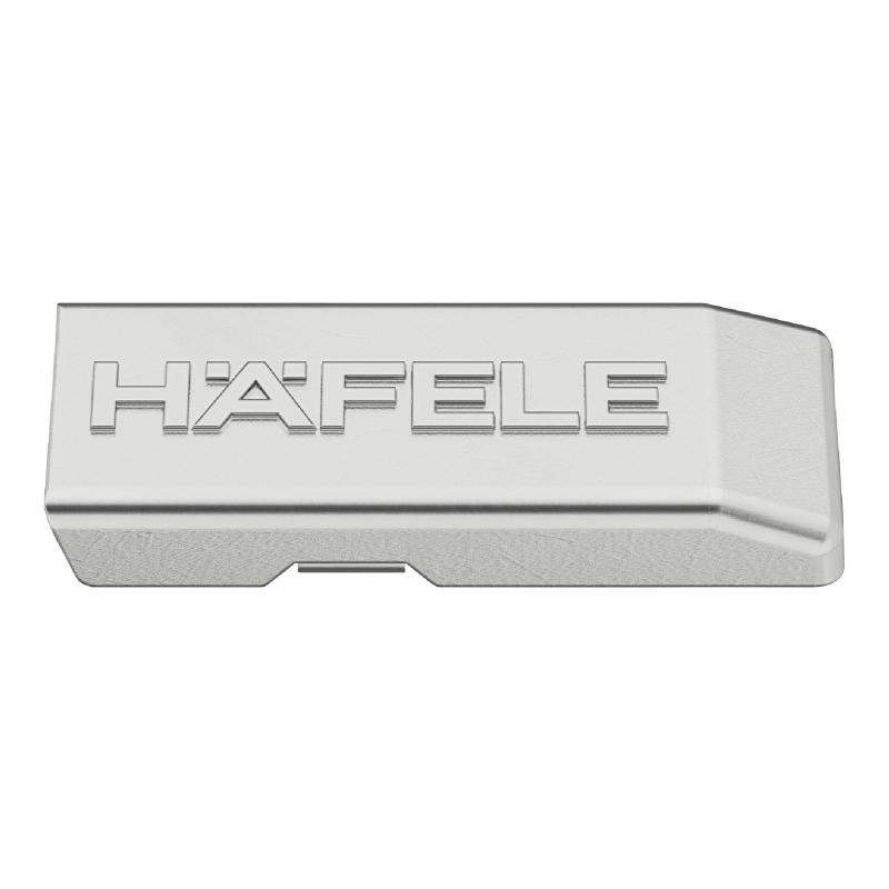 Tapa embellecedora para bisagra Metalla SM 310 semiparche. Acero niquelado con logotipo Häfele para brazos acodados. Compatible series 110 A/SM y 310 A/SM. Acabado profesional para bisagras vistas en cocinas y mobiliario diseño.