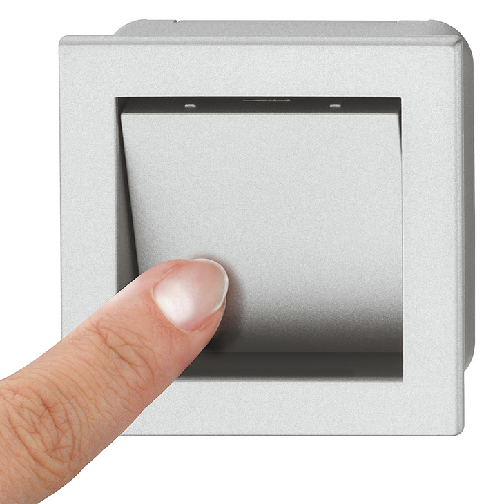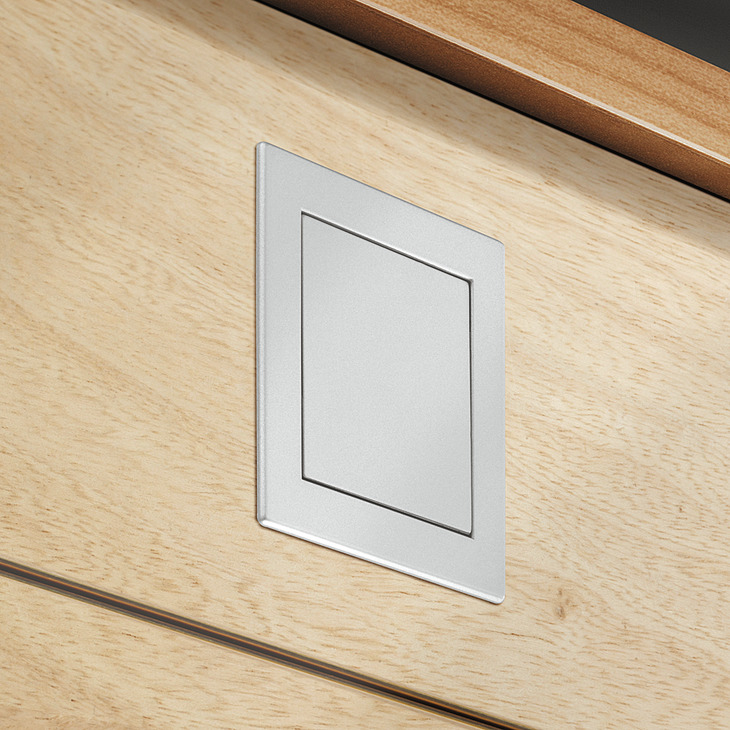 Tirador embutido plástico color aluminio 78x78mm. Sistema apertura por presión, tapa integrada. Caja embutible 73x73mm, profundidad 13mm, distancia taladros 64mm. Diseño minimalista sin tiradores visibles. Ideal cocinas, armarios modernos.