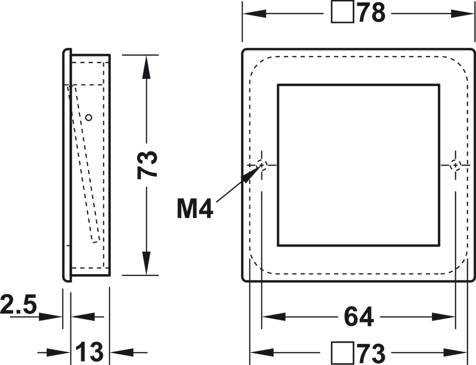 Exterior visible: 78 × 78 mm (cuadrado perfecto)